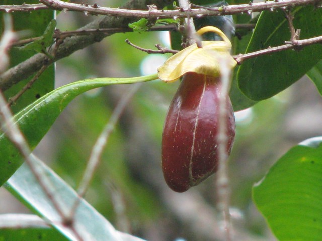 In a different exclosure was another rare plant: Kaulu (Pteralyxia macrocarpa). It is the last of the natives in the dogbane family (Apocynaceae) that I had not seen. Unlike the other members (Maile, Hao & Holei), Kaulu is much more restricted. Plants in the genus Pteralyxia are only found on the older islands of Kaua’i and O’ahu. P. macrocarpa is only found on O’ahu. Differing from Holei in the last post, Kaulu is pretty distinctive. The leaves are much larger and there is only 1 leaf per node. Luckily, this particular plant had fruit, showing another way to identify it: