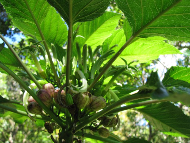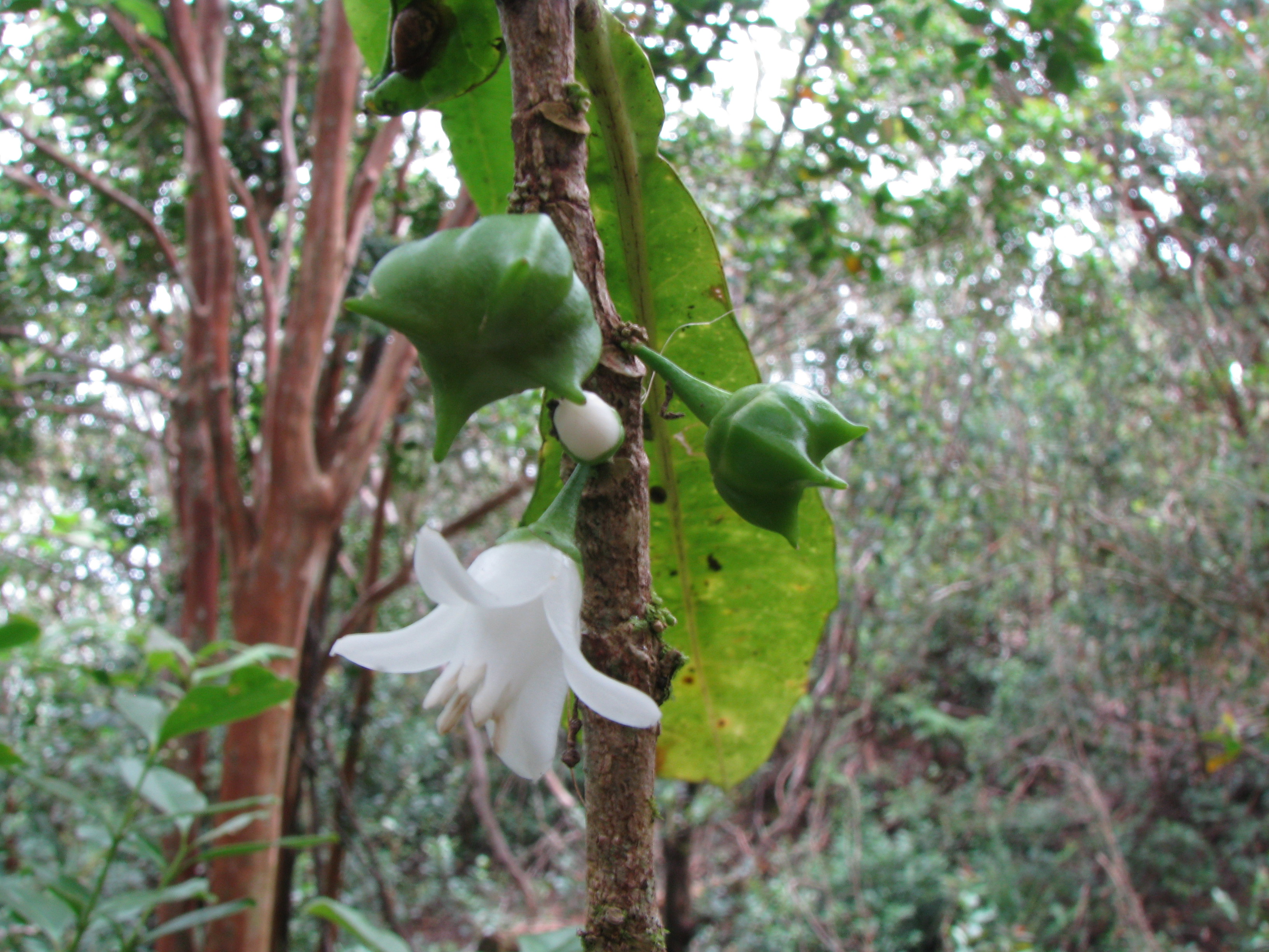 Schidea obovatum is a rare plant found only in the Wai’anaes. This species was recently moved from the genus Alsinidendron.There is a naturally occurring individual nearby, but the population we visited were outplanted. The ones that I saw were quite healthy. At least, healthy enough to throw out these vaguely sinister looking flowers.