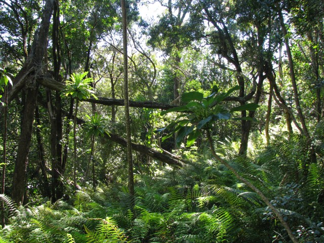 Here is an undifferentiated green mass. Why am I showing this badly contrasted photo? Well, the trees that dominate the top 1/4 of the picture with the silvery leaves are Kukui (Aleurites moluccana). Nothing special there for the native plant botanist. It’s the tree in the middle, right below the Kukui with all the dead branches that warrants the posting of this shot. It’s Fluggea!