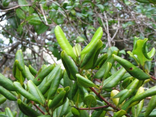 Finally something a little easier for me. Many of the Hawaiian plants in Coprosma and Hedyotis have new growth that looks like puckering lips. This is specimen is pilo (Coprosma foliosa).