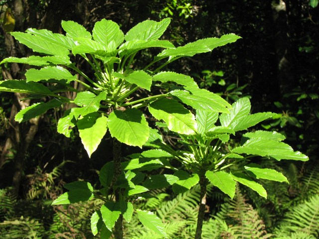 - *Identification: Form– Branched or unbranched shrubs 1-3 m tall. Leaves– ovate to ovate-lanceolate; blades 12-30 cm long by 6-17 cm wide; margins crenate, denticulate, serrate, or doubly serrate; petioles 6-18 cm long. Flower– hypanthium ovoid to cylindrical; calyx lobes subulate, 0.5-1 mm long; corolla white or greenish white, curved, 45-60 mm long with 1 dorsal knob