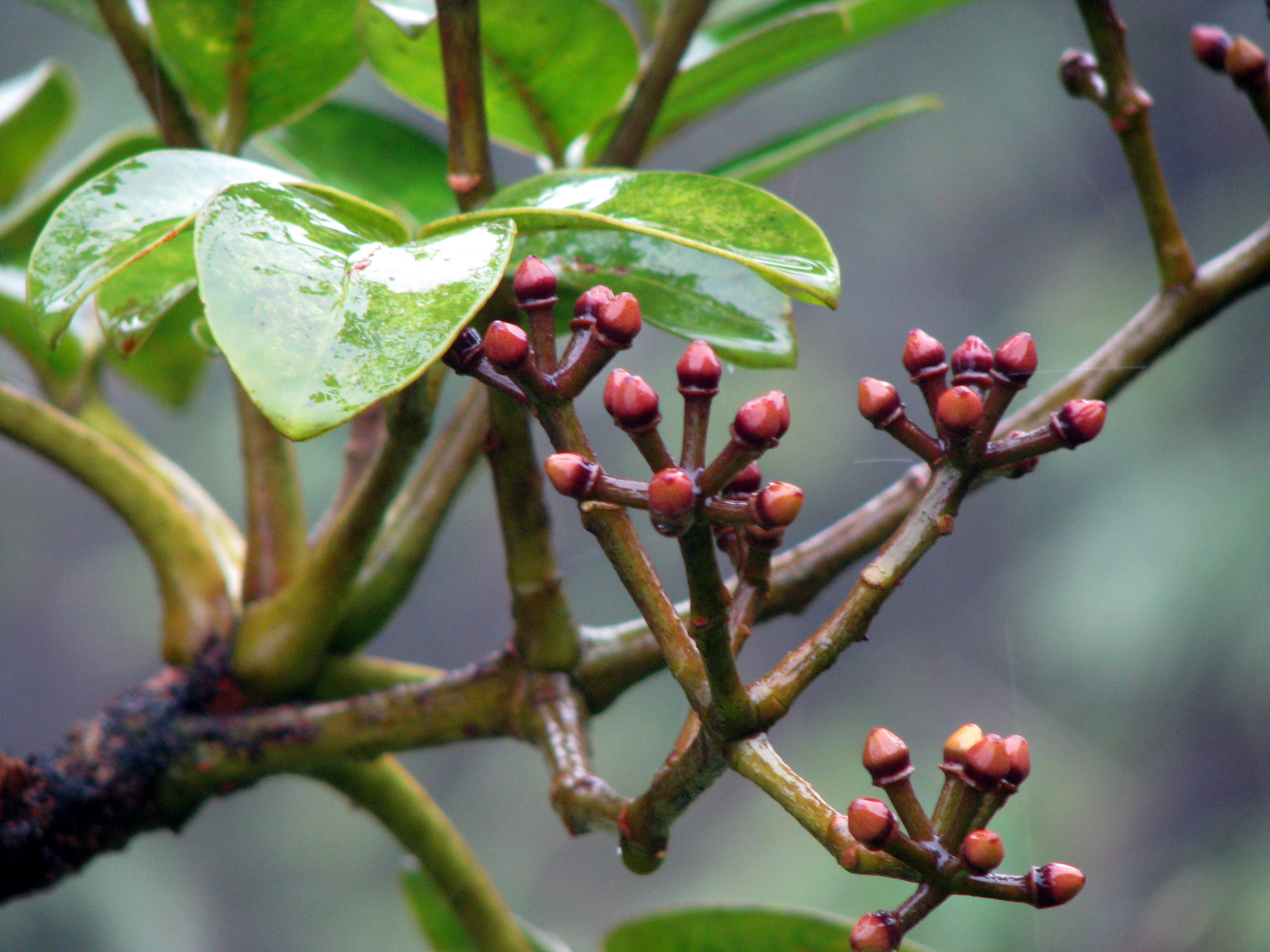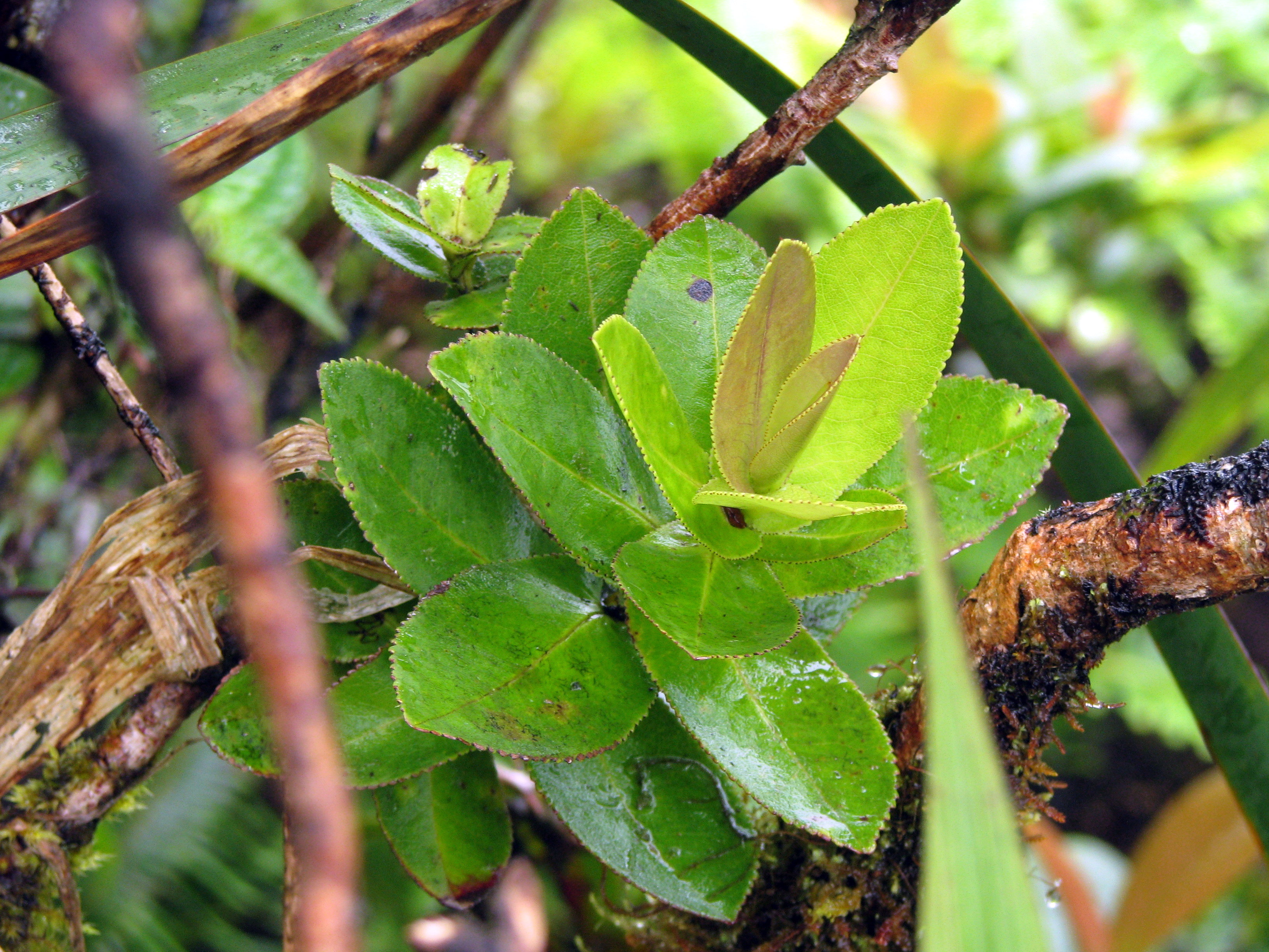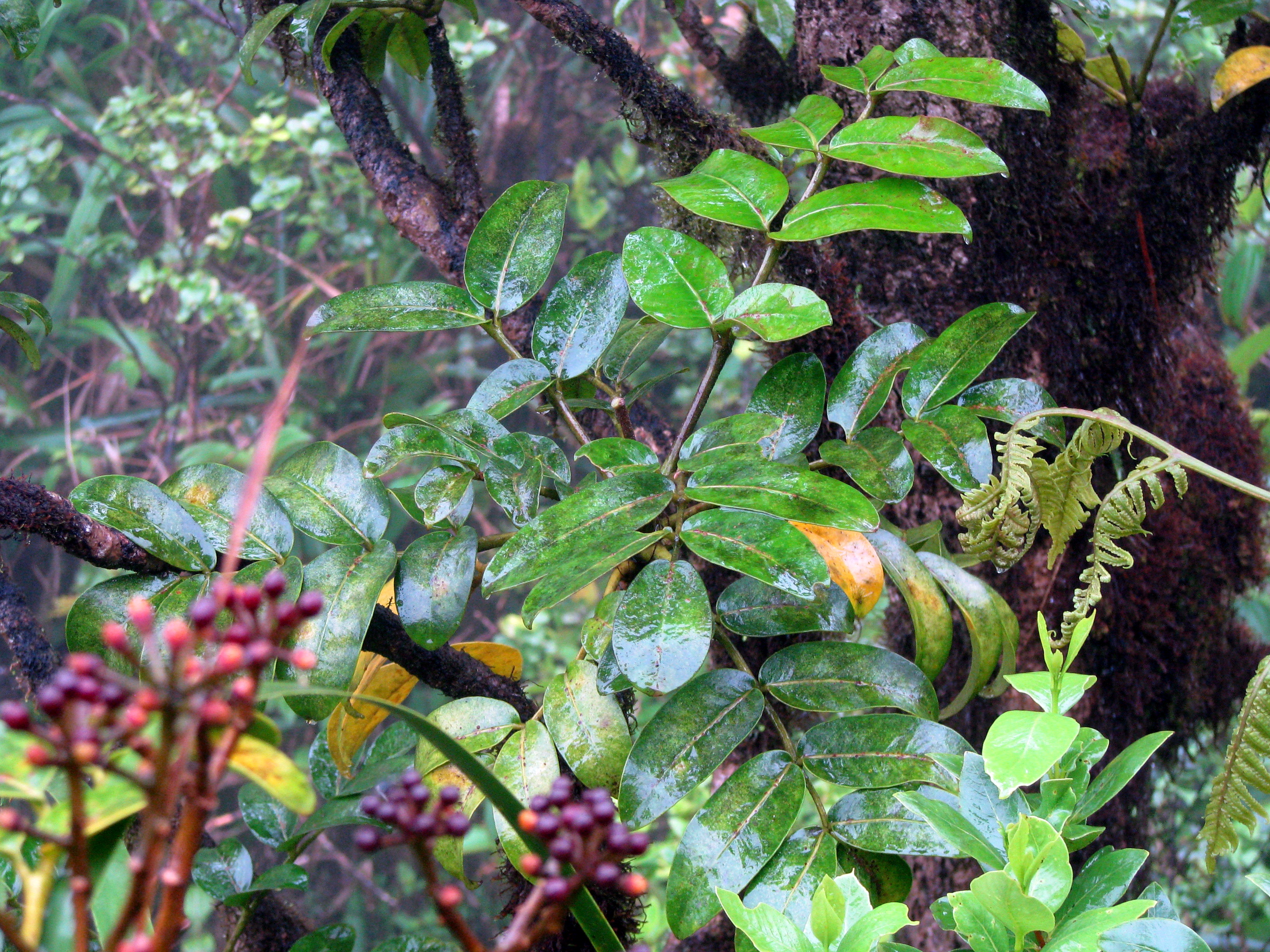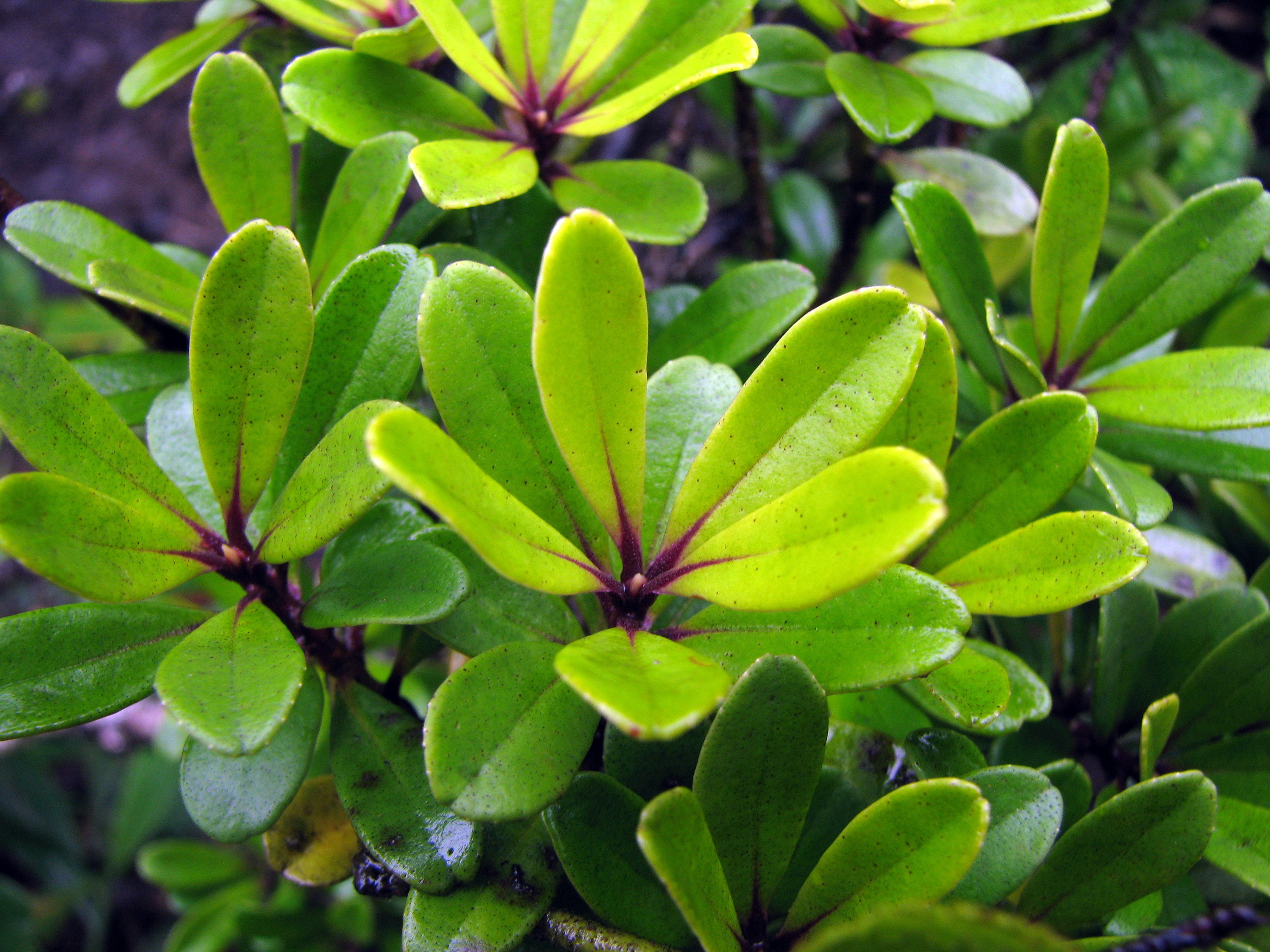 And here’s the opposite. This very rare plant is Anini (Eurya sandwicensis), the only native member of Theaceae or the Tea Family. It almost looks like an over-sized Ohelo.