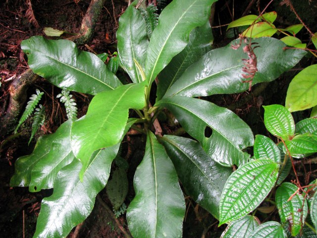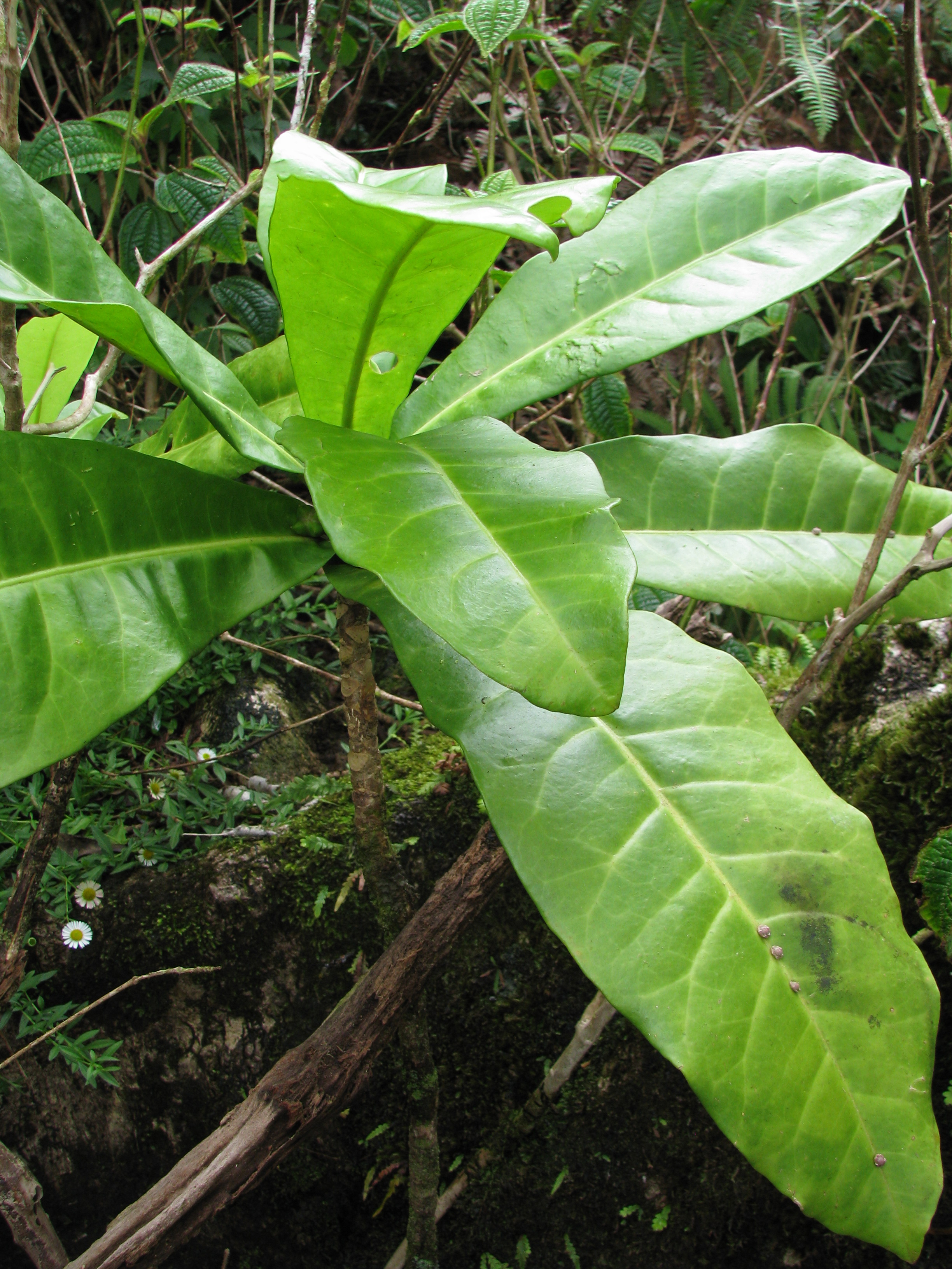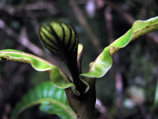 At the base of these Kaulu trees is another rare plant! Amazing! Platydesma cornuta var. cornuta is found only in the Ko’olaus. It is very similar to the decurrens variety of the Wai’anaes, differing mainly in the more abrupt leaf base in the Ko’olau populations.