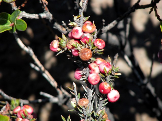 One plant found above the clouds is familiar to the average hiker. Found on many of the drier trails throughout the islands, Pukiawe (Leptecophylla tameiameiae) is also found in good numbers on the cinder cones at the top of Mauna Kea. These guys had some of the largest Pukiawe fruit I have seen so far.