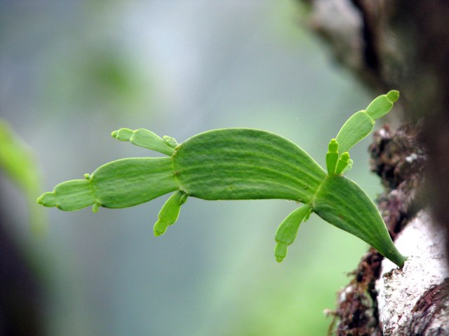 I couldn’t resist this picture when we came across it. This common species of Hulumoa (Korthalsella complanata) is found on a number of native host trees. On Bobea spp. it is typically much bigger than when found on other trees. Although, it’s usually not this distinctive. This young individual is so… saurimorphic. (Yeah, I made that up). Although, why not? If we can have diapsids mimicking plants (see Leaf-tailed Gecko), why can’t we have plants mimicking diapsids?