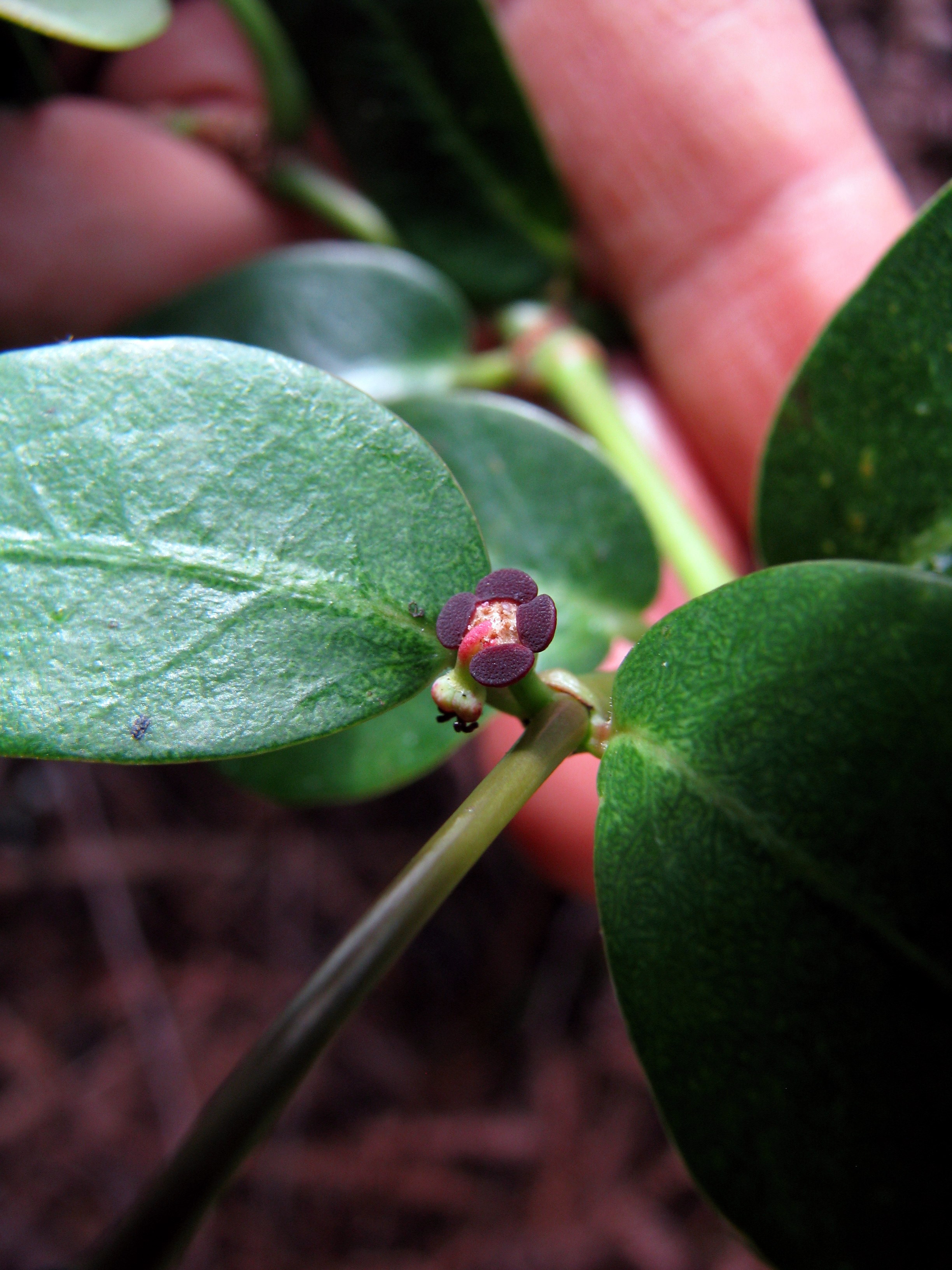 More tiny flowers! This is an Akoko (Chamaesyce multiformis var. multiformis). As many of you know, what looks like the flower is actually a specialized involucre called a cyathia. The staminate flowers are the white parts in the middle, while the pistillate flower is the droopy thing hanging from the cyathia. (what a cool word!) The “droopiness” is actually diagnostic for multiformis; on Chamaesyce celastroides, the gynophore is held upright.