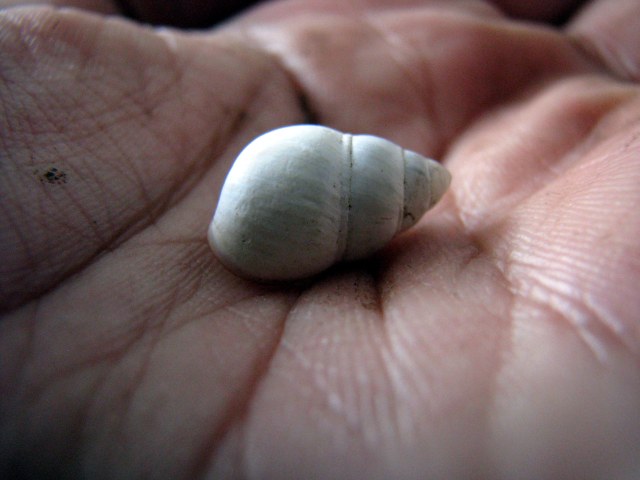 All hope is not lost. Notice that some of the shells are bleached white. Those shells that have lost all or most of their color are from snails that died long ago. But one of the shells is still quite colorful. Its owner was still alive until fairly recently. That got us to thinking, “maybe, just maybe they’re still around”. And, after an exhaustive search… success! Here’s a picture to end on a high note.