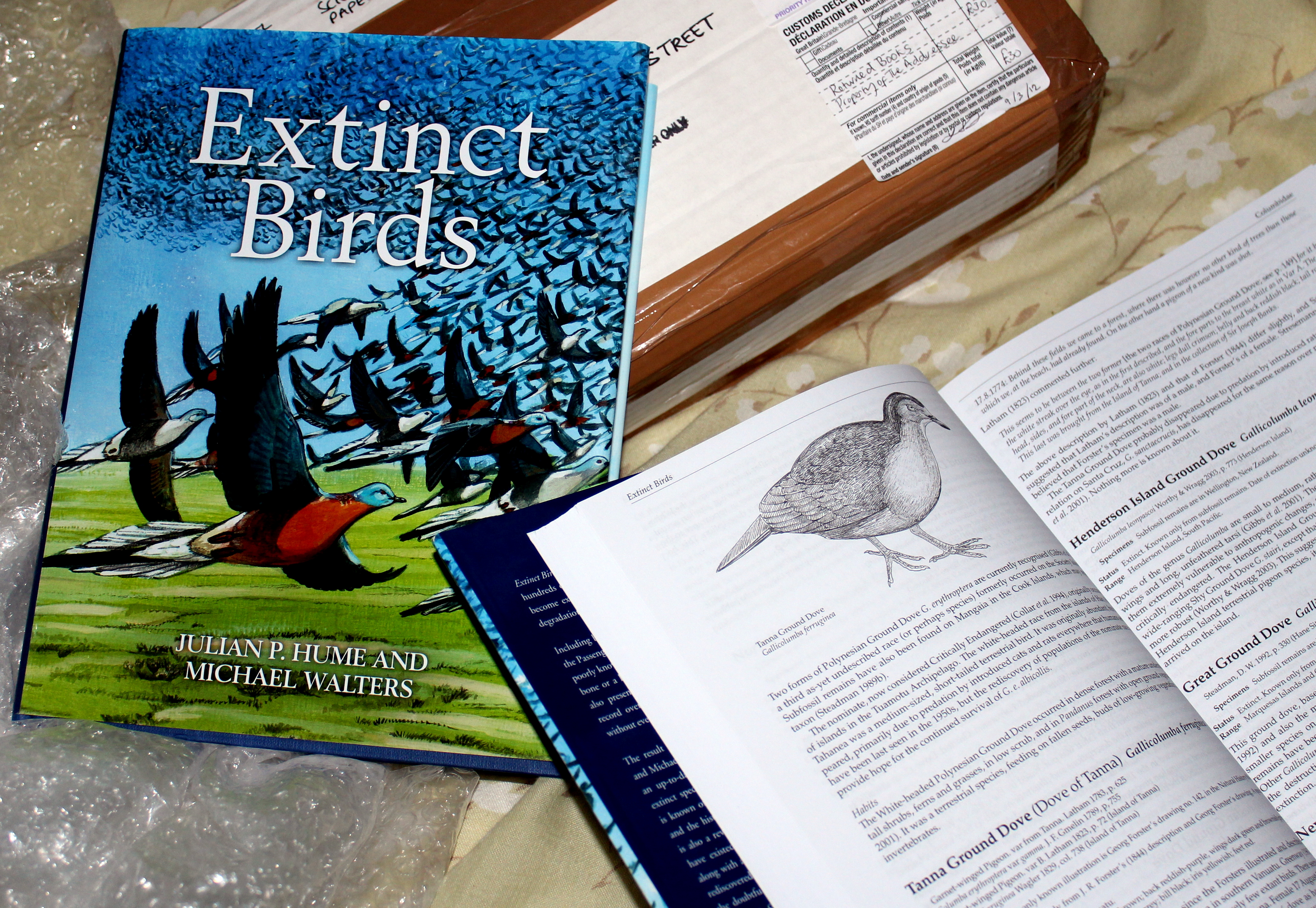 The long line at the Kapalama post office on a Saturday morning was absolutely worth it; today I received my copies of Hume and Walters’ Extinct Birds. I’ve been reading it all day and it’s wonderful! It is a great primer on just about every bird species and subspecies that went extinct in *historical times.