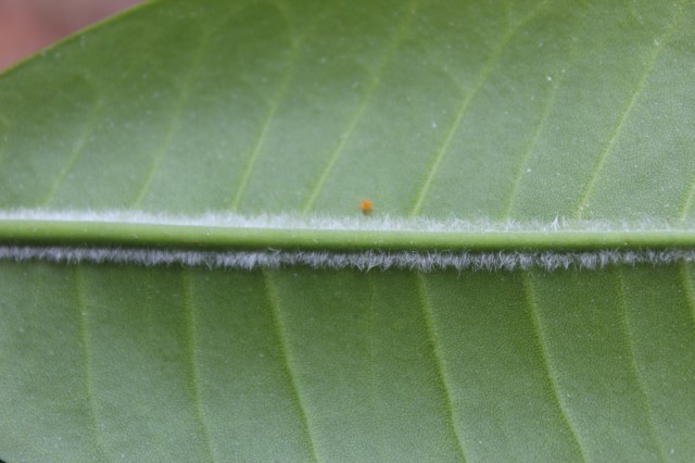 One of these was this Melicope barbigera. The common name for this alani on Kaua’i is uahiapele which can be translated as Pele’s smoke. After seeing the underside of the plant, you see why this name is appropriate. Diagnostic to this species, all along the midrib of the leaves are dense, gray hairs.