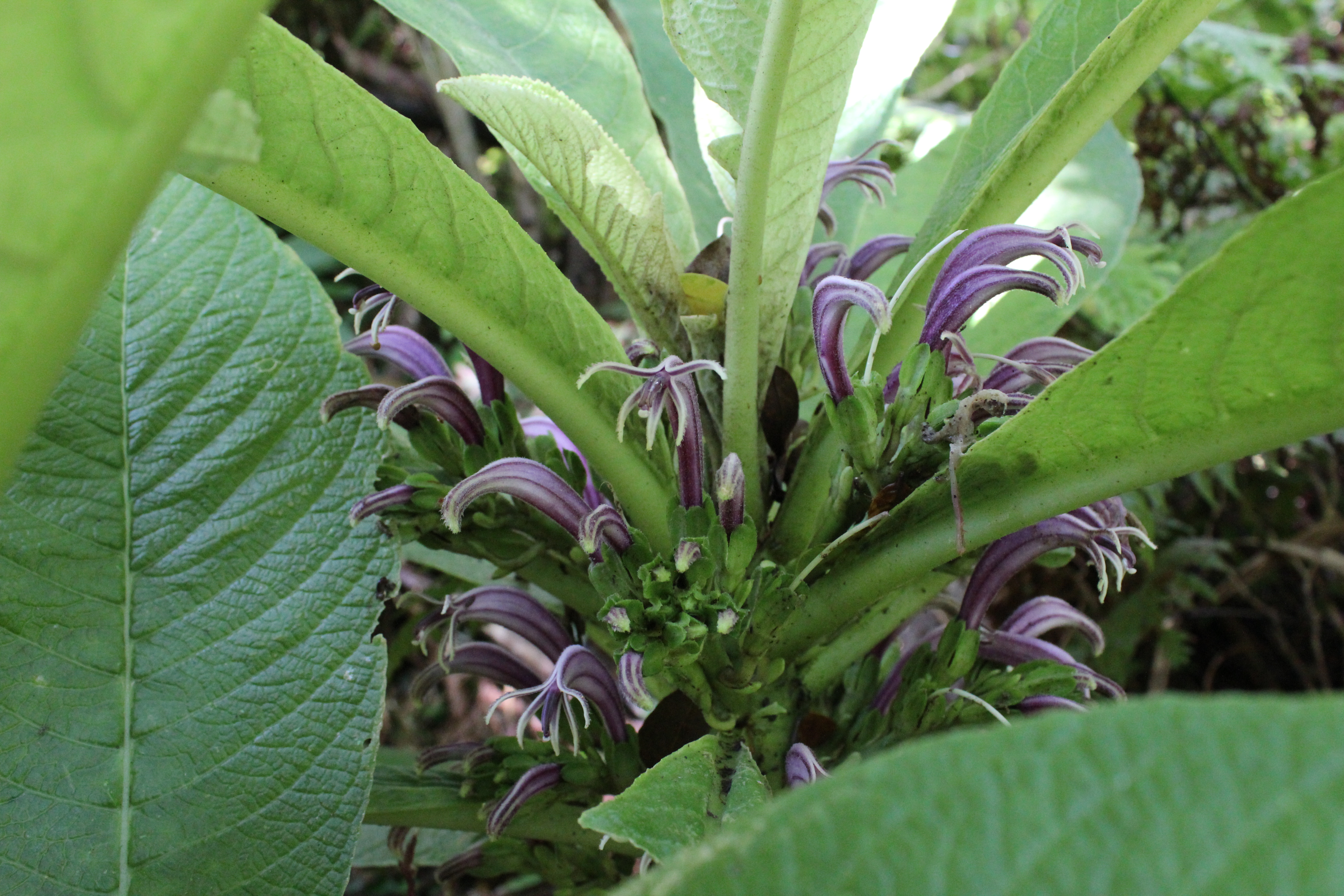 We’ve been monitoring the health of a specimen of Cyanea crispa, an awesome lobeliad found in the dark understorey of Ko’olau forests. A few months back, a rotten ‘ohia branch crashed down mere feet away from this plant. It survived that close call and is now in full flower! Let’s hope it loves the word cleistogamy.