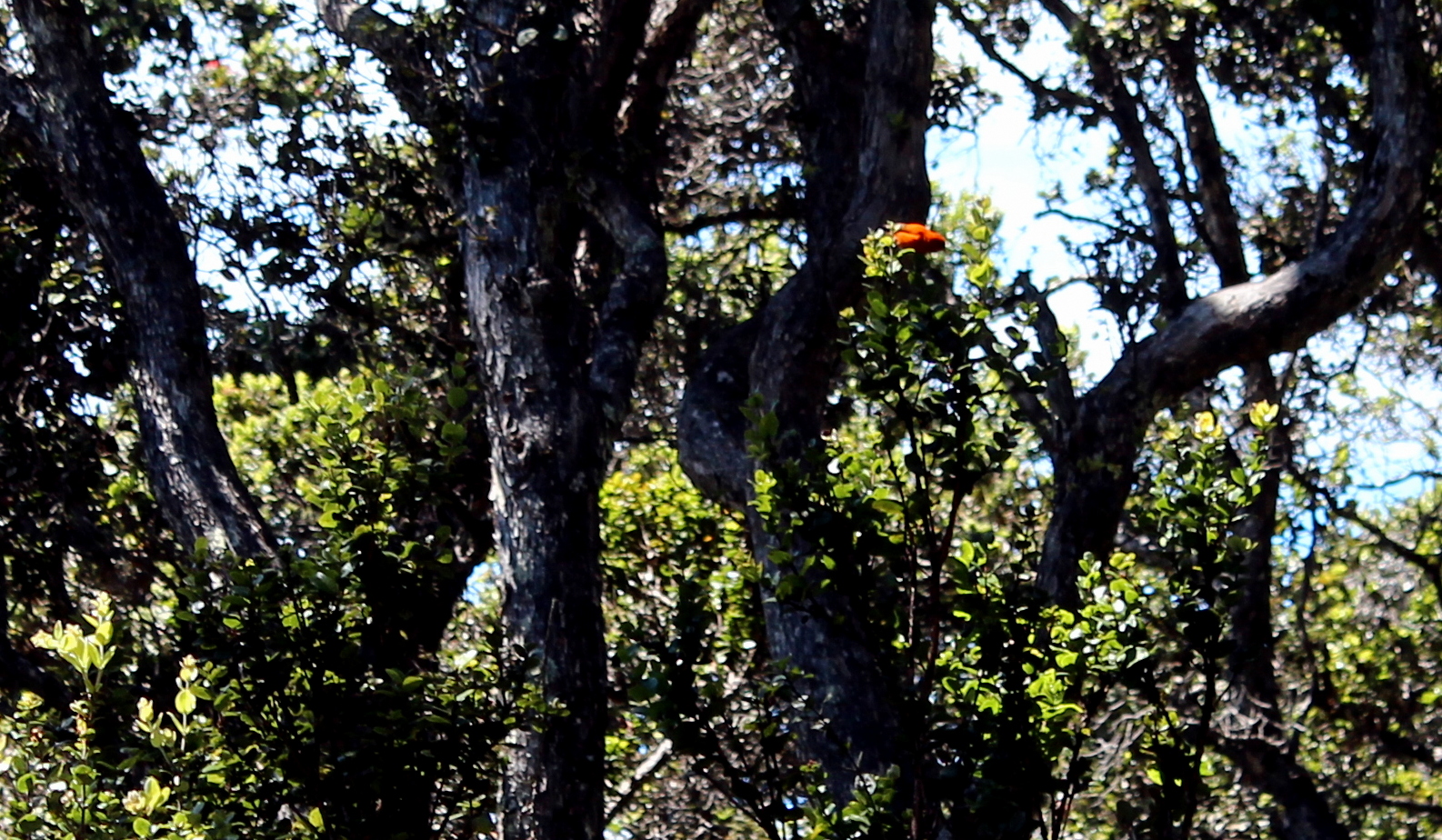 ‘Akepa (Loxops coccineus) are brightly colored insectivores found only in high elevation forests of the big island. These photos show you why I take photos of sedentary plants instead of highly active little birds! If I were a halfway decent photographer these would have been killer photo-ops. Alas, they are neat shots of ‘ohia trees with smidges of native birds. But what these photos don’t fully capture (aside from the birds smartypants) is what spectacular viewing our group had of some rare big island endemics. In fact, ‘akepa were much easier to track through binoculars than i’iwi. Their forgaging habit of checking the liko of ‘ohia trees was pleasantly slow and methodical. We were lucky that the birds happened to be in some trees down in a gulch. Instead of craning our necks to see birds high in the canopy, these treetops were just about at eye level.