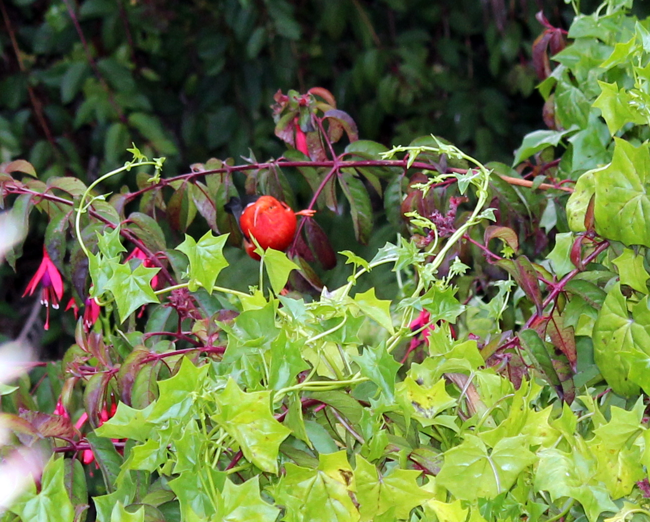 Those are dire-sounding words, which is why it was so great to see them in such abundance at Hakalau. I’iwi were everywhere! They were chasing each other around, driving off Hawaiian ‘amakihi (Hemignathus virens subsp. virens) and resourcefully taking nectar from non-native fuschia plants. It was such a good sign for the future.