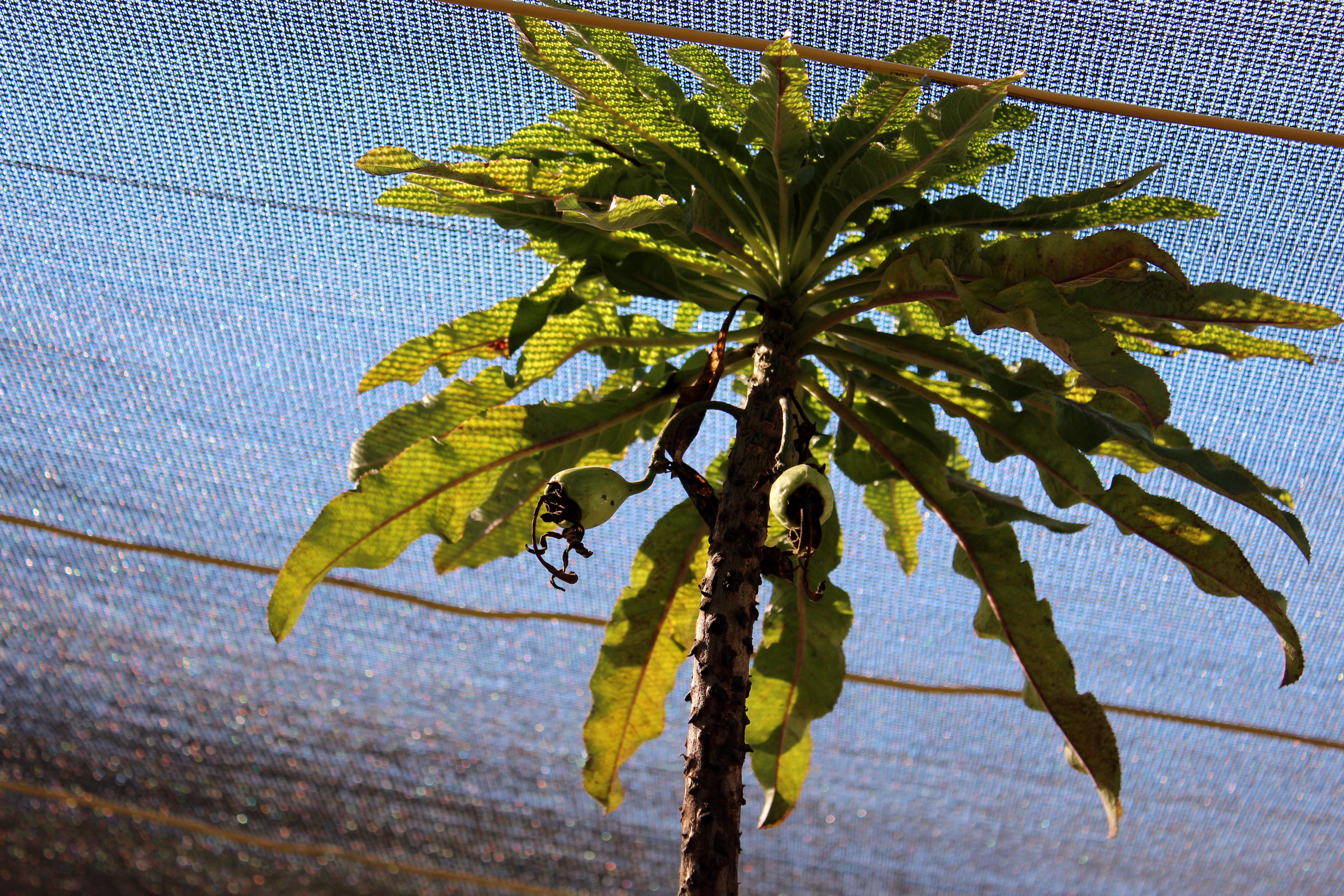 Baron had not one, but two species of Oha wai (Clermontia spp.) growing at the greenhouse. There are a number of differences between Clermontia lindseyana and C. pyrularia. I chose these two pictures to highlight some of the differences visible even on immature fruit: C. pyrularia fruit have a much smoother skin than the ribbed fruit of C. lindseyana.