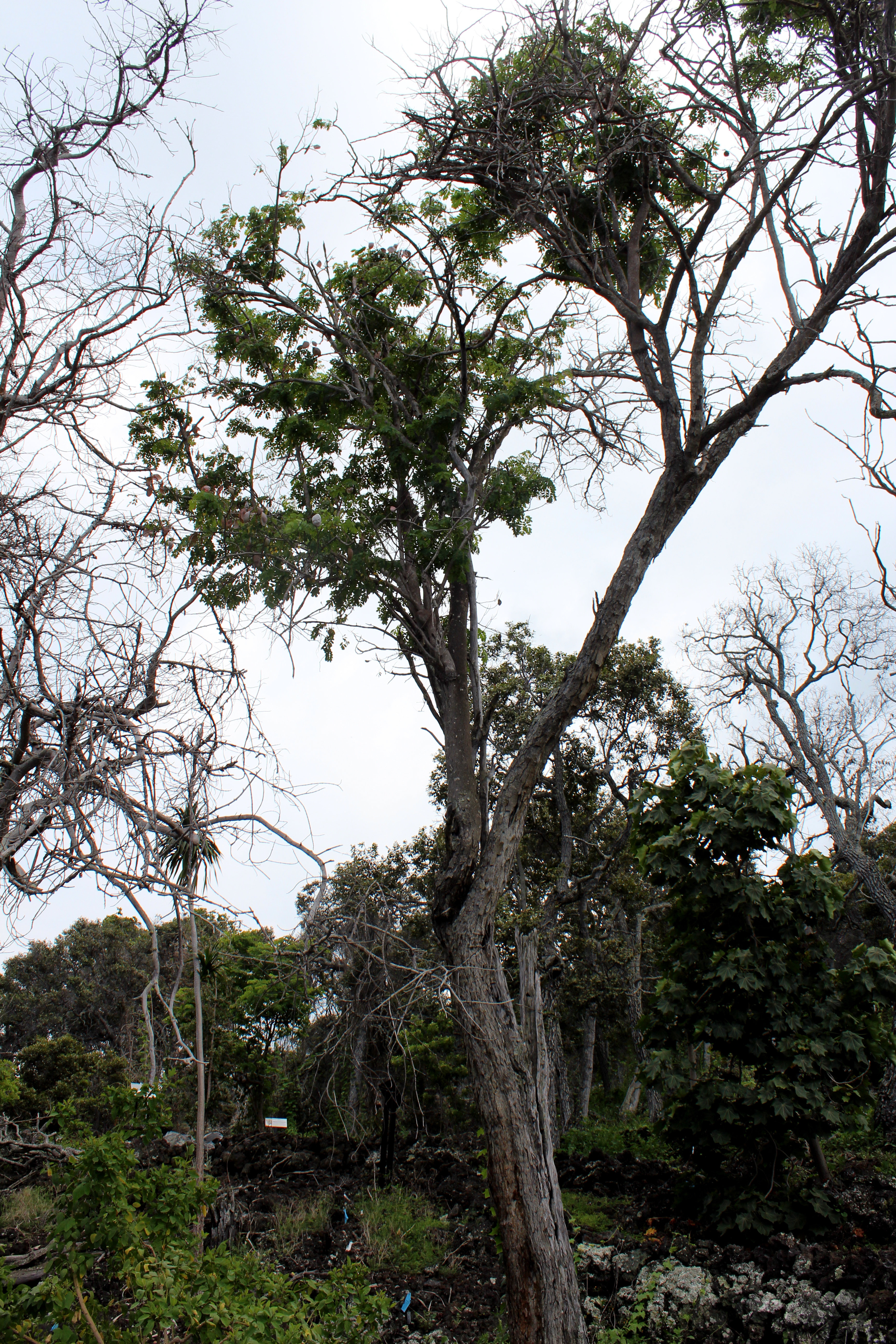 I spend much of my time in mesic and wet forest in the hills around Honolulu. But even compared to dryland forest here on O’ahu, Ka’upulehu was very foreign to me. For one it is right off the highway. It is such an irony that dryland trees are some of the most endangered yet, paradoxically, some of the easiest trees to see. One of the biggest threats to dryland plants here in Hawaii is habitat destruction. That’s not much different from many threaten plants and animals. But it is a specific type of habitat destruction that affects dry forest: urban development. Throughout the state; dry, sunny areas near the ocean have become prime real estate. Lahaina, Honolulu, Ewa Beach, Kapolei, Hawai’i Kai, Wailea, Kailua-Kona… these areas were all once mighty dryland forests. Most urban areas in the state have obliterated their dry forest. But it wasn’t so complete on the Big Island. Hence, this pocket of dry forest at Ka’upulehu is a few minutes from a residential neighborhood.