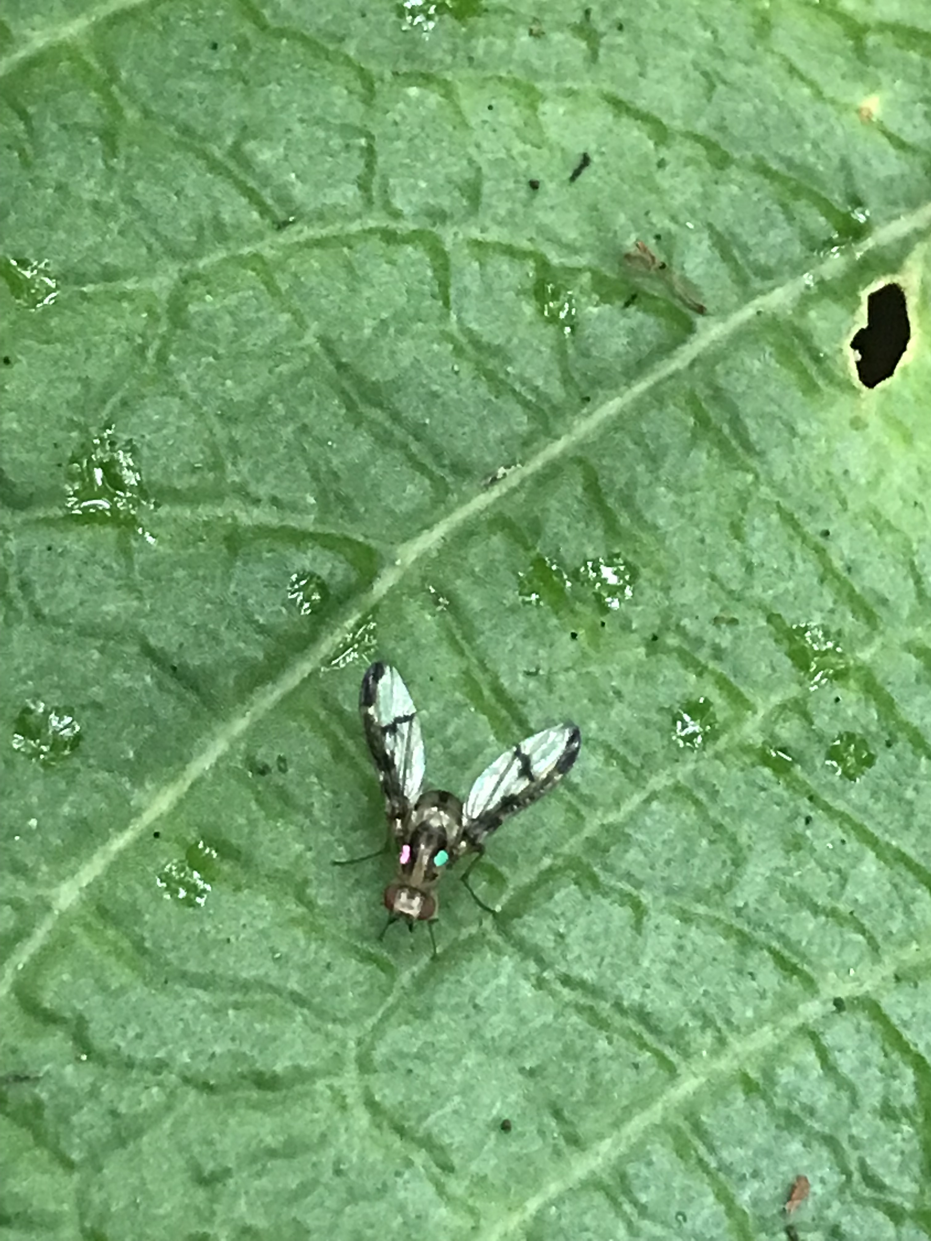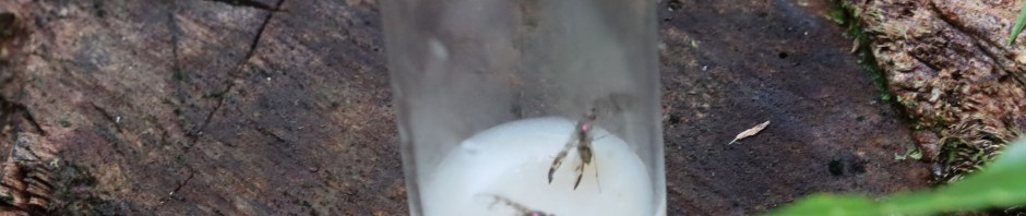 Apologies for the grainy photos, but these taken from my iPhone are of the endangered species Drosophila hemipeza. It’s hard to tell the scale for the photos but they are much larger than the common fruit flies (Drosophila melanogaster) you see in your house; D. hemipeza is just a bit smaller than a housefly. It’s from a special day for these flies when they were reintroduced to native forests. This species is a main focal point of extensive efforts by scientists to help in its conservation. They have, through research and effort, developed a way to captive rear this species to help ensure its survival. A big part of the challenge is that many of its host plants (Clermontia, Cyanea) are themselves highly endangered.