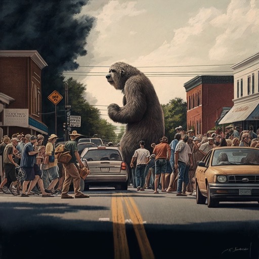 Enter A.I. generated art. A dear friend of mine, Nick Needle is a great artist and has also been playing around with A.I. I asked him to prompt it to show a giant ground sloth crossing a busy street in the style of Norman Rockwell. These are what he came up with: