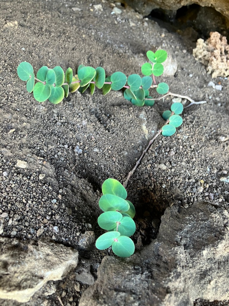 I was really pleased to come across this plant. Right as one crests the ridgeline, there is a large rocky overhang that provides a decent amount of shade even in the mid-day sun. I am sure many hikers rest here before they take their photos at the top. And right under this overhang are a couple `akoko (Euphorbia degeneri). From my perspective it’s a little annoying, there are several species of non-native Euphorbia which are quite weedy, they’ll pop up just about anywhere. But the native `akoko, the plants that evolved in this place are having a much rougher go of it. I only saw a handful of individuals.