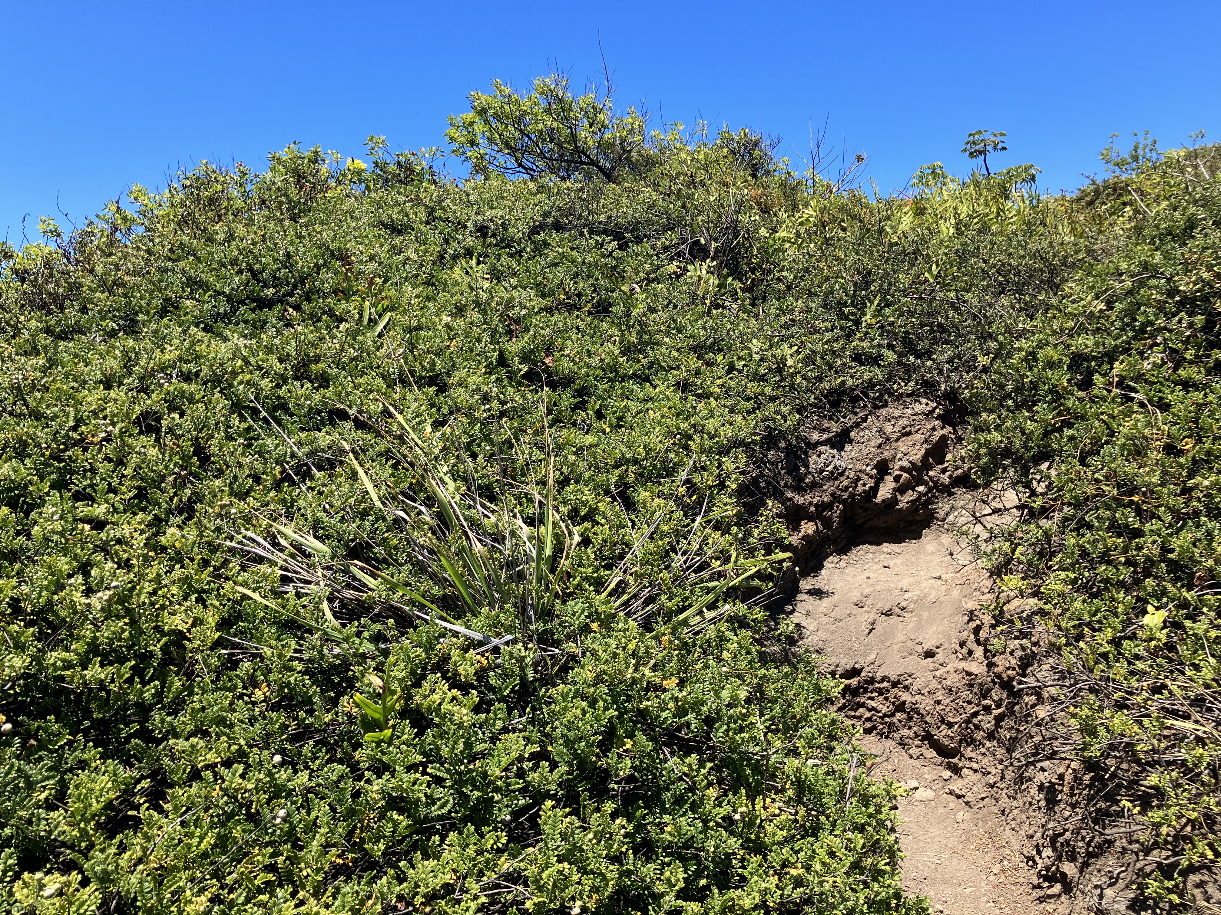 Another native we came across was this `ulei (Osteomeles anthyllidifolia). Like elsewhere, `ulei can still form dense thickets. At the top of crouching lion, large areas were still dominated by this hardy native plant.